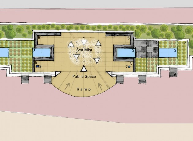 The final design has built on both the ‘’Sea Mist’’ concept and the historic narrative. The central area of the fountain will be made accessible from the south via a ramped surface. The plaza which is formed will be surfaced in solid paving with a central feature of a group of fragmented white rocks. Water misters flush with the surface of the paving will create a ‘’sea mist’’ which children and adults can walk through.
